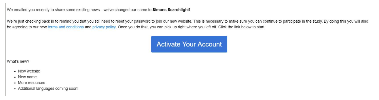 If you don’t receive an email from Simons Searchlight asking you to verify your email address via a code or you are unable to log into your account after you verify, please email us at coordinator@simonssearchlight.org.