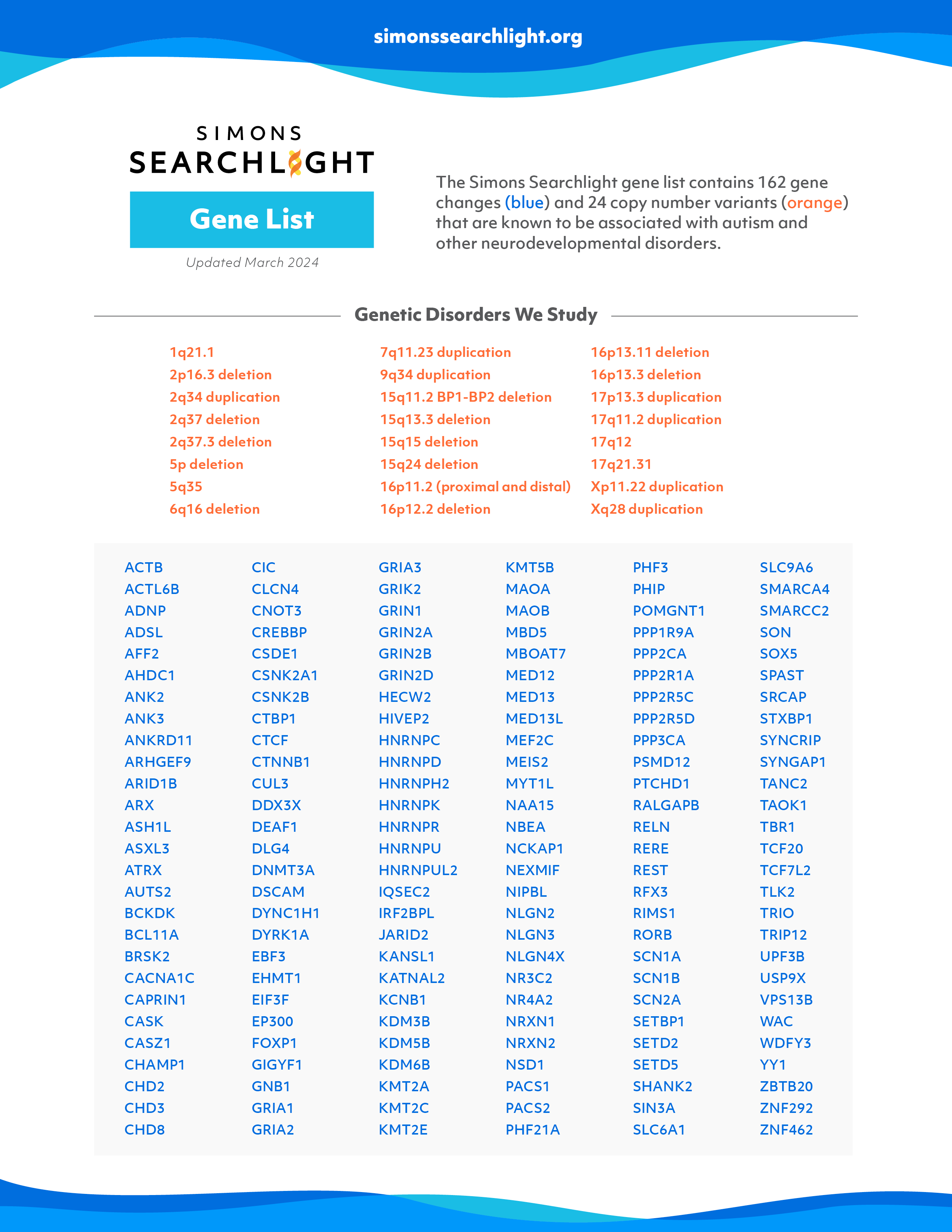 Die Liste der Gene, die Simons Searchlight untersucht, ändert sich mit der Zeit. Wir werden weiterhin Gene hinzufügen oder entfernen, wenn wir neue Informationen über Gene erhalten, die mit neurologischen Entwicklungsstörungen, einschließlich Autismus-Spektrum-Störungen, in Verbindung stehen. Diese Liste wird durch neue Forschungen und Veröffentlichungen beeinflusst und mit der SPARK-Genliste koordiniert. Die Gene, die Simons Searchlight untersucht, werden von einem Team aus Genetikern, genetischen Beratern, Medizinern und führenden Forschern bestimmt.