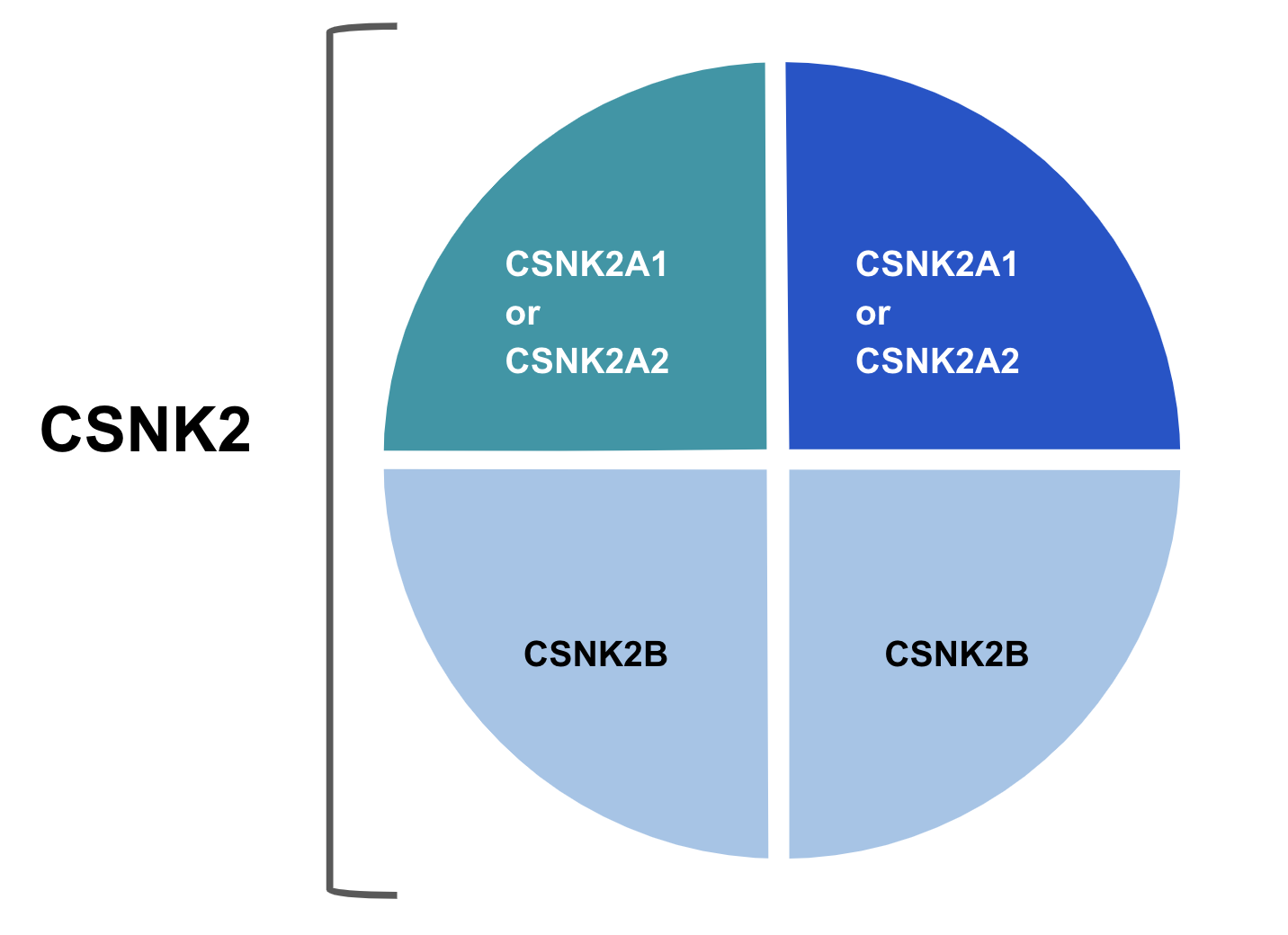 - The instructions to make the CSNK2A1, CSNK2A2, and CSNK2B protein subunits are in genes located on three different chromosomes