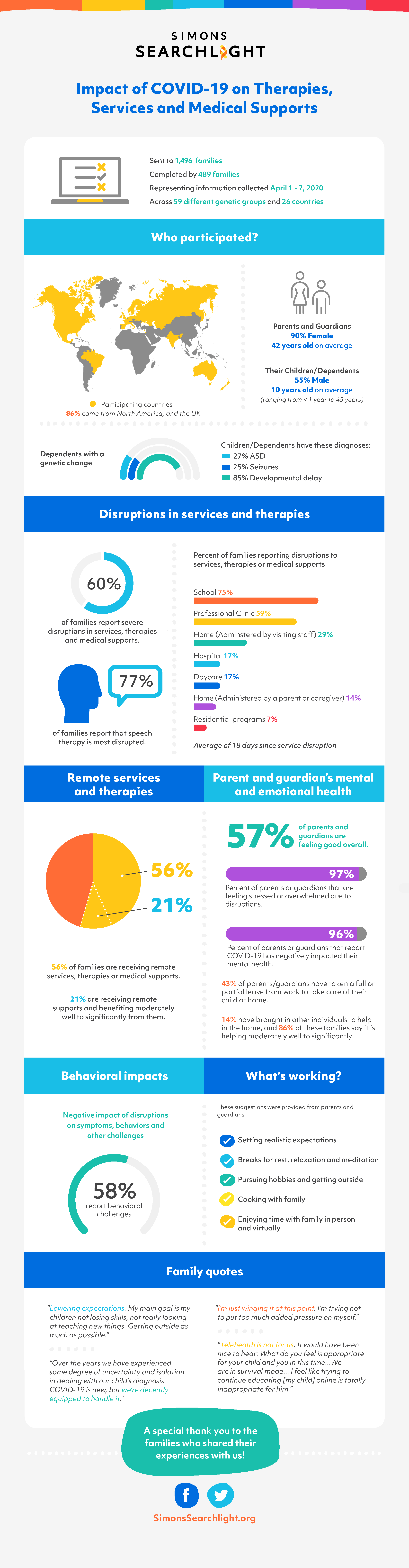 489 genitori o caregiver di Simons Searchlight hanno risposto al sondaggio sull’impatto della COVID-19 su terapie, servizi e supporti medici lanciato il1° aprile 2020.
